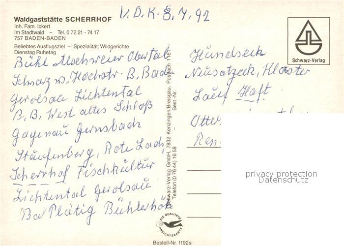 73321202 Baden-Baden Waldgaststaette Scherrhof Gastraum Vesperplatte Mahlerstein Gedenkstein postalisch nicht gelaufen Erhaltung siehe scans [FriedD77] KatCode: 11110008211000