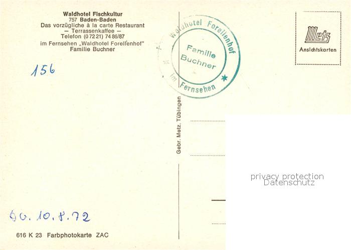 73608712 alte Postkarte Baden-Baden Waldhotel Fischkultur postalisch gelaufen Erhaltung siehe scans [WerneD78] KatCode: 11110008211000