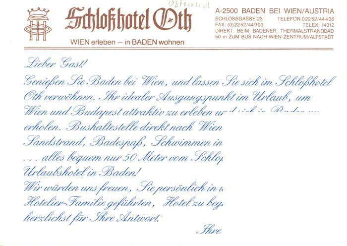 73925122 Baden Wien AT Schlosshotel Oth Park Schloss Schwimmbad Panorama Ortspartie Waldweg postalisch nicht gelaufen Werbekarte (keine Postkarte) Erhaltung siehe scans [FriedD77] KatCode: 11390127030604