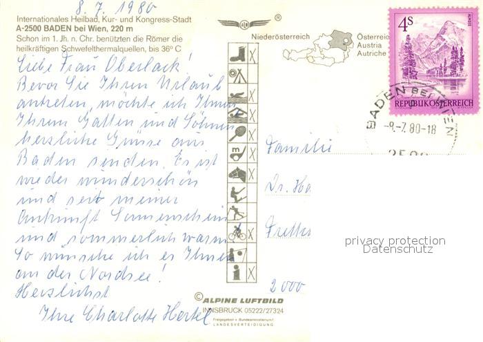 73230959 alte Postkarte Baden Wien Fliegeraufnahme postalisch gelaufen Erhaltung siehe scans [FriedD77] KatCode: 11390127030604