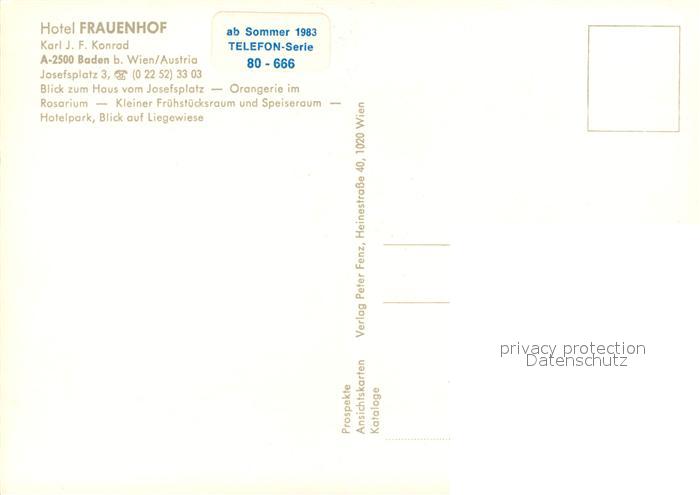 73605965 Baden Wien Hotel Frauenhof Orangerie im Rosarium Fruehstuecksraum Hotelpark Liegewiese postalisch nicht gelaufen Erhaltung siehe scans [WerneD78] KatCode: 11390127030604