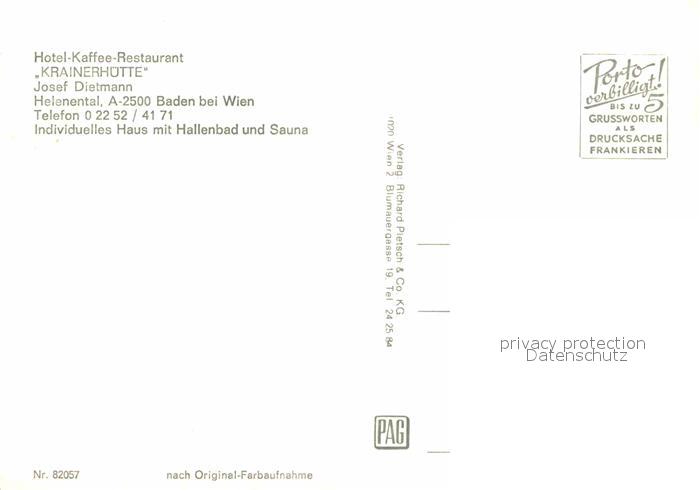 72855149 Baden Wien Hotel Kaffee Restaurant Krainerhuette postalisch nicht gelaufen Erhaltung siehe scans [AndreD76] KatCode: 11390127030604