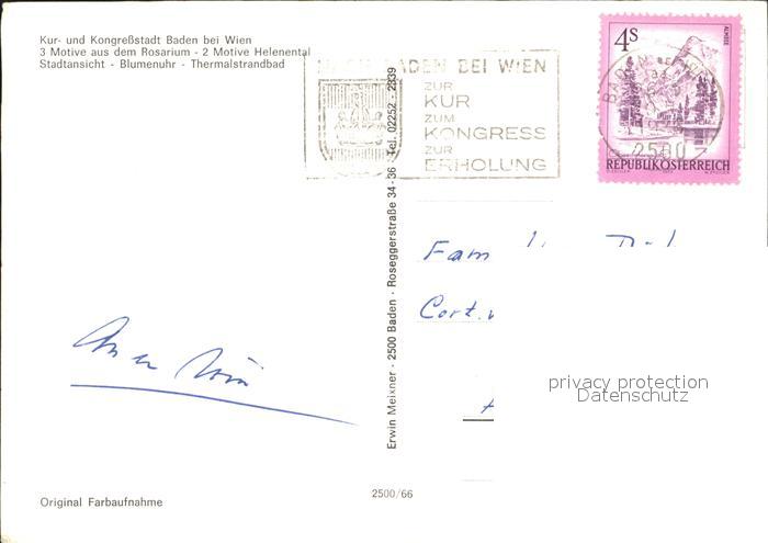 72378732 alte Postkarte Baden Wien Kur- und Kongressstadt Blumenuhr Stadtansicht Thermalstrandbad postalisch gelaufen Erhaltung siehe scans KatCode: 11390127030604