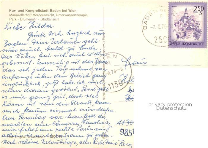 72773504 alte Postkarte Baden Wien Mariazellerhof Therapie Park Blumenuhr Stadtansicht Kur und Kongresstadt postalisch gelaufen Erhaltung siehe scans [FriedD77] KatCode: 11390127030604