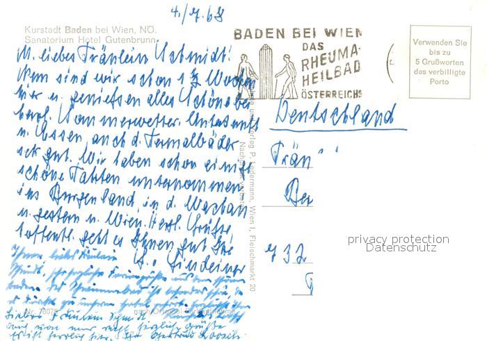 73157145 alte Postkarte Baden Wien Sanatorium Hotel Gutenbrunn postalisch gelaufen Erhaltung siehe scans [FriedD77] KatCode: 11390127030604