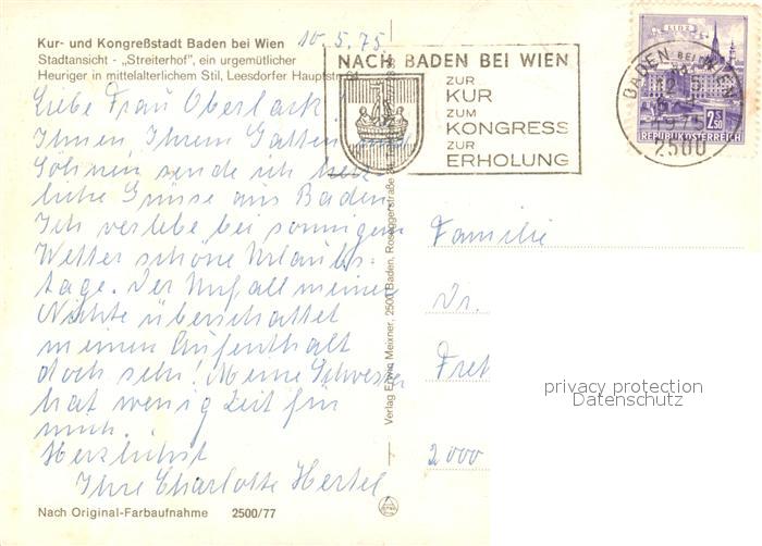 73230953 alte Postkarte Baden Wien Stadtpanorama mit Kirche Streiterhof Heuriger in mittelalterlichem Stil postalisch gelaufen Erhaltung siehe scans [FriedD77] KatCode: 11390127030604