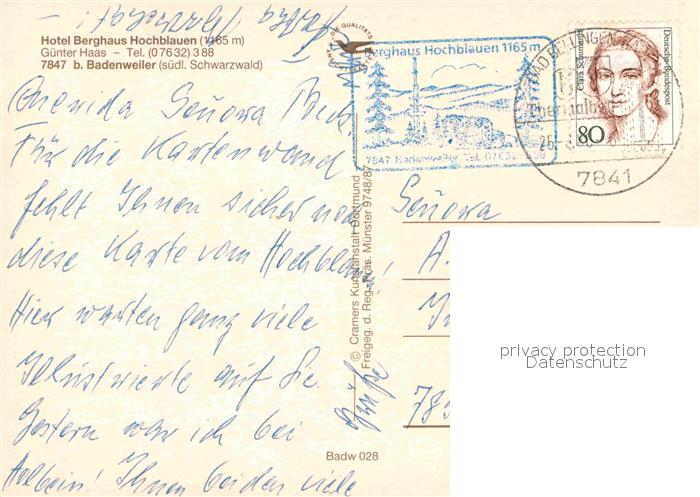 72849833 alte Postkarte BADENWEILER BW Hotel Berghaus Hochblauen postalisch gelaufen Erhaltung siehe scans [NatalD47] KatCode: 11110008315007