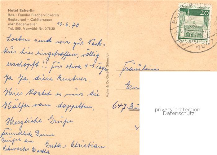 73066418 alte Postkarte BADENWEILER BW Hotel Eckerlin Restaurant Cafeterrasse Schwarzwald postalisch gelaufen Erhaltung siehe scans [FriedD77] KatCode: 11110008315007