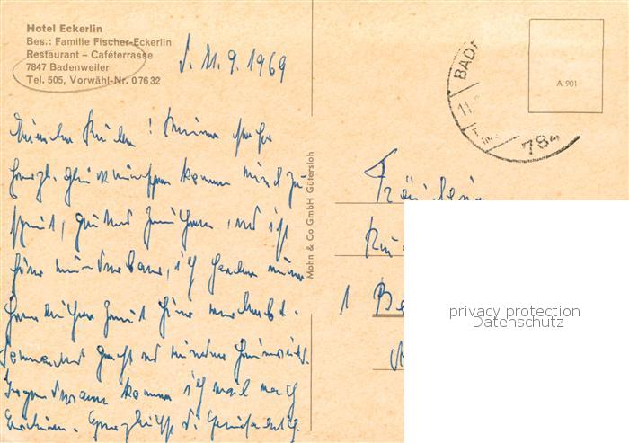 73793620 BADENWEILER BW Hotel Eckerlin Restaurant Terrasse Kurort im Schwarzwald postalisch gelaufen Erhaltung siehe scans [FriedD77] alte Postkarte Frie Katcode 11110008315007