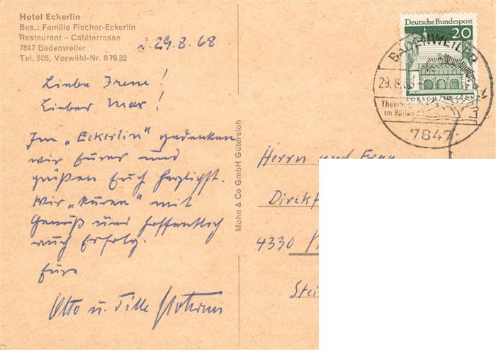 73923648 BADENWEILER BW Hotel Eckerlin postalisch gelaufen Erhaltung siehe scans [WerneD78] alte Postkarte Wern Katcode 11110008315007
