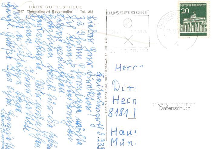 73865515 BADENWEILER BW Hotel Gasthof Haus Gottestreue Thermalkurort im Schwarzwald postalisch gelaufen Erhaltung siehe scans [FriedD77] alte Postkarte Frie Katcode 11110008315007