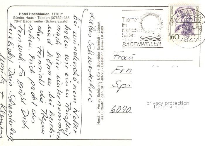 73007674 alte Postkarte BADENWEILER BW Hotel Hochblauen postalisch gelaufen Erhaltung siehe scans [WerneD78] KatCode: 11110008315007