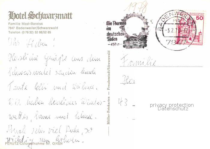 72887308 alte Postkarte BADENWEILER BW Hotel Schwarzmatt Restaurant postalisch gelaufen Erhaltung siehe scans [LiesaD40] KatCode: 11110008315007