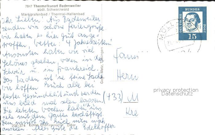 72506539 alte Postkarte BADENWEILER BW Markgrafenbad postalisch gelaufen Erhaltung siehe scans KatCode: 11110008315007