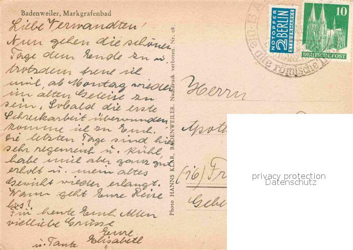 72693122 alte Postkarte BADENWEILER BW Markgrafenbad postalisch gelaufen Erhaltung siehe scans [LiesaD40] KatCode: 11110008315007