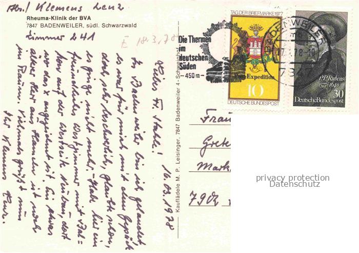 74157684 alte Postkarte BADENWEILER BW Rheuma-Klinik BVA Kurhotel Fliegeraufnahme Schwarzwald Garten Park Kurpark postalisch gelaufen Fliegeraufnahme Erhaltung siehe scans [Karloger] KatCode: 11110008315007