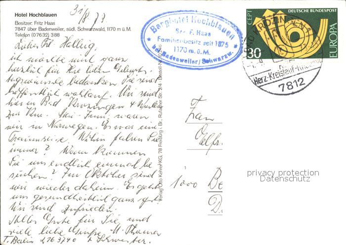 72050416 alte Postkarte BADENWEILER BW Rund um den Hochblauen Berghotel Schwarzwald postalisch gelaufen Erhaltung siehe scans KatCode: 11110008315007