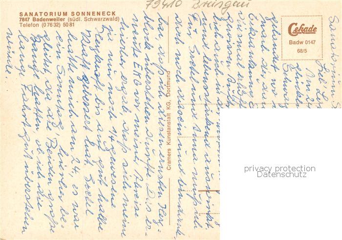 73766963 BADENWEILER BW Sanatorium Sonneneck postalisch nicht gelaufen Erhaltung siehe scans [FriedD77] Frie Katcode 11110008315007