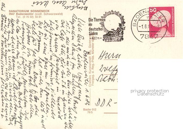 73701706 BADENWEILER BW Sanatorium Sonneneck postalisch gelaufen Erhaltung siehe scans [WerneD78] alte Postkarte Wern Katcode 11110008315007