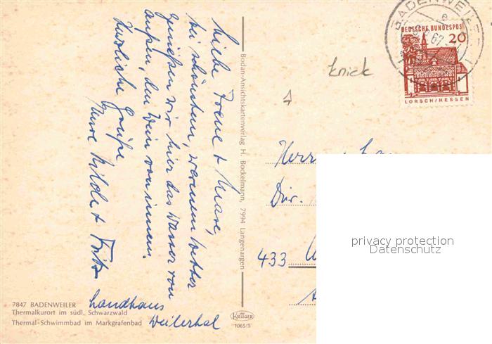 72848140 alte Postkarte BADENWEILER BW Thermalschwimmbad Markgrafenbad Kurort im Schwarzwald postalisch gelaufen Erhaltung siehe scans [FriedD77] KatCode: 11110008315007