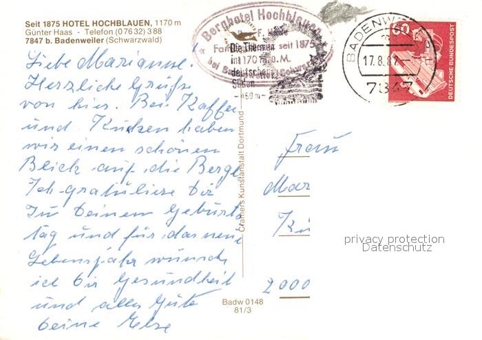 73160707 alte Postkarte Badenweiler Hotel Hochblauen postalisch gelaufen Erhaltung siehe scans [KathaD81] KatCode: 11110008315007