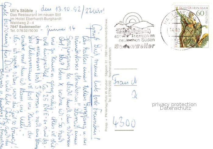 73542847 alte Postkarte Badenweiler Uli’s Stueble Restaurant Hotel Eberhardt Burghardt postalisch gelaufen Erhaltung siehe scans [FriedD77] KatCode: 11110008315007