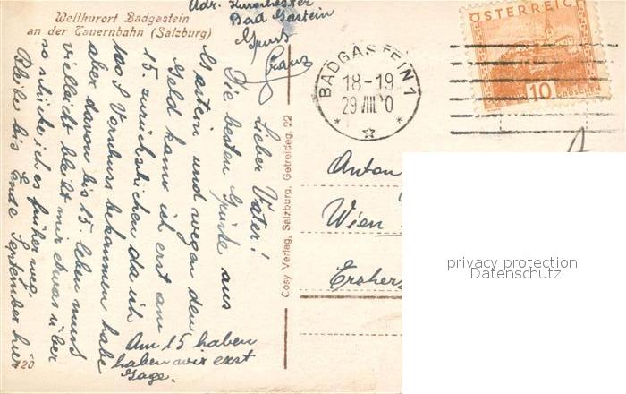 43093262 alte Postkarte Badgastein an der Tauernbahn postalisch gelaufen Erhaltung siehe scans [WerneD78] KatCode: 11390