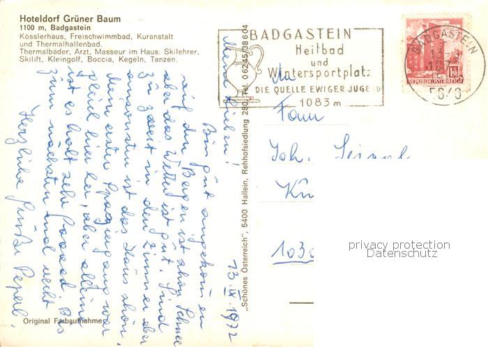 73848638 alte Postkarte Badgastein AT Hoteldorf Gruener Baum Freischwimmbad Koesslerhaus Kuranstalt postalisch gelaufen Erhaltung siehe scans [WerneD78] KatCode: 11390