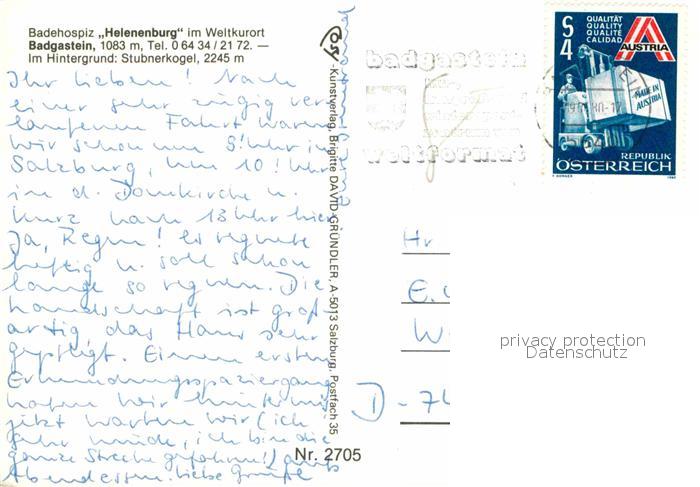 72802835 alte Postkarte Badgastein Badehospiz Helenenburg Weltkurort im Hintergrund Stubnerkogel postalisch gelaufen Erhaltung siehe scans [FriedD77] KatCode: 11390