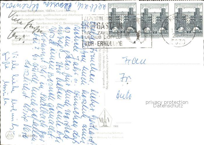 72306734 alte Postkarte Badgastein Fliegeraufnahme Schwimmbad Teilansicht Kutschenfahrt postalisch gelaufen Erhaltung siehe scans KatCode: 11390