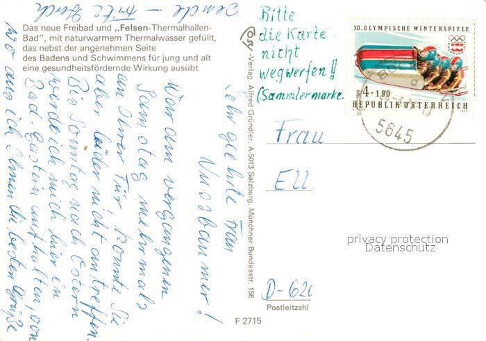 73156593 alte Postkarte Badgastein Freibad Felsen Thermalhallenbad postalisch gelaufen Erhaltung siehe scans [FriedD77] KatCode: 11390