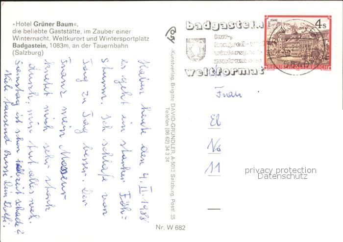12397915 alte Postkarte Badgastein Hotel Gruener Baum postalisch gelaufen Erhaltung siehe scans KatCode: 11390
