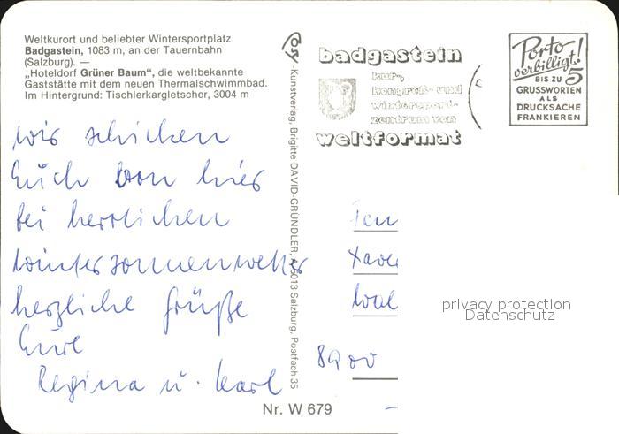 72439083 alte Postkarte Badgastein Hoteldorf Gruener Baum postalisch gelaufen Erhaltung siehe scans KatCode: 11390