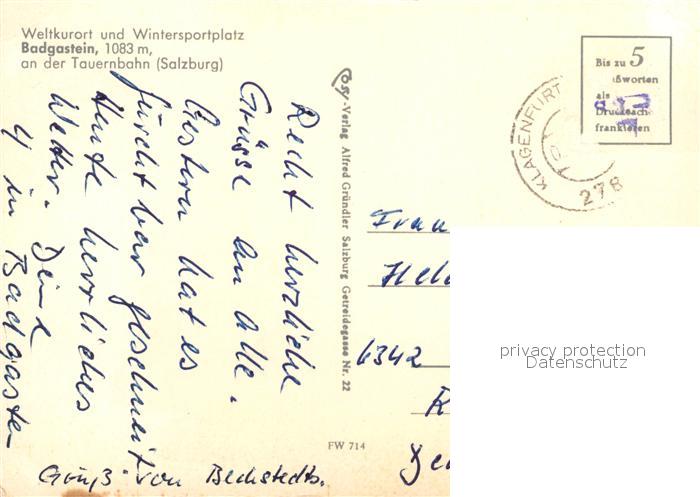 73150893 alte Postkarte Badgastein Teilansicht Kurort Wintersportplatz an der Tauernbahn postalisch gelaufen Erhaltung siehe scans [FriedD77] KatCode: 11390