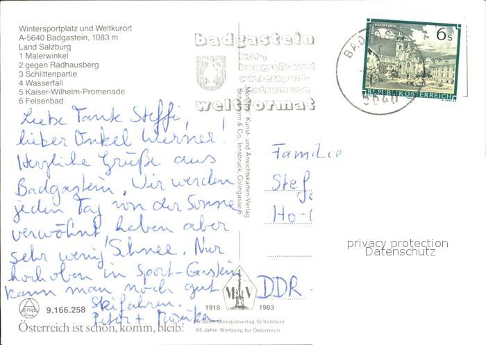 72407014 alte Postkarte Badgastein Wintersportplatz Malerwinkel Radhausberg Schlittenfahrt Wasserfall Kaiser Wilhelm Promenade Felsenbad postalisch gelaufen Erhaltung siehe scans KatCode: 11390
