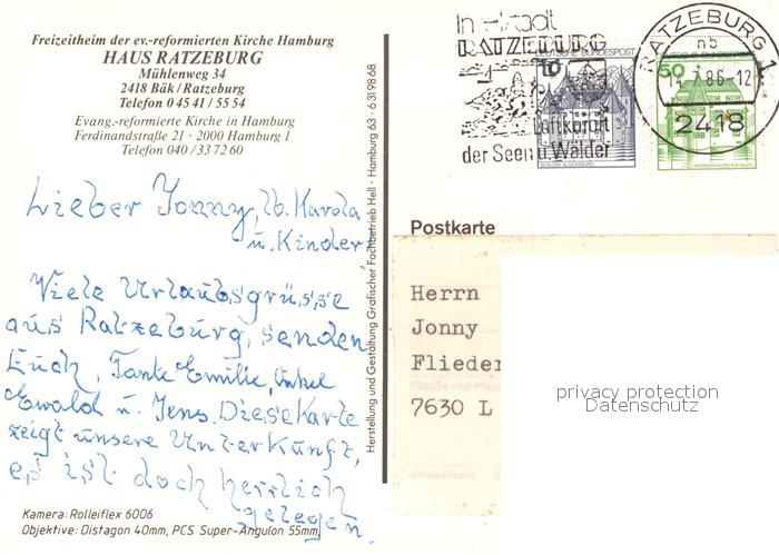73324224 alte Postkarte Baek Freizeitheim Haus Ratzeburg Ratzeburger See Naturpark Lauenburgische Seen postalisch gelaufen Erhaltung siehe scans [FriedD77] KatCode: 11110001053004