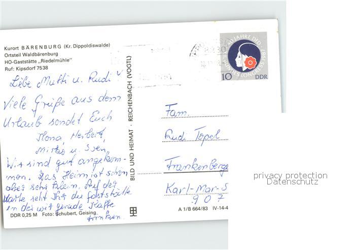 72384038 alte Postkarte Baerenburg Sachsen HO- Gaststaette Riedelmuehle postalisch gelaufen Erhaltung siehe scans KatCode: 11110014290010