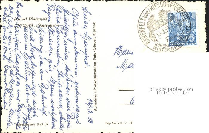 72272071 alte Postkarte Baerenfels Erzgebirge FDGB Ferienheim postalisch gelaufen Erhaltung siehe scans KatCode: 11110014290010