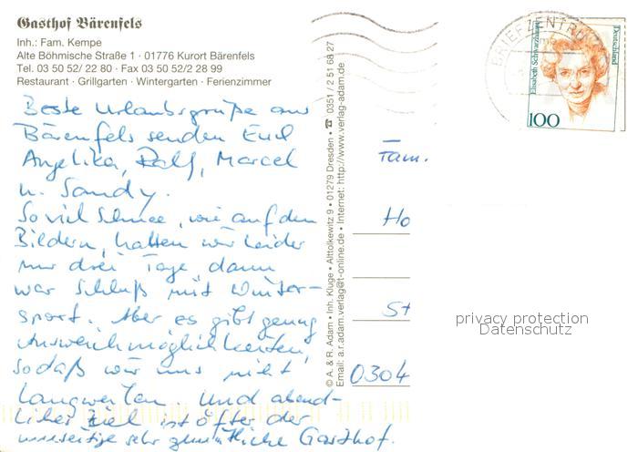 73652862 alte Postkarte Baerenfels Erzgebirge Gasthof Baerenfels Winterlandschaft postalisch gelaufen Erhaltung siehe scans [FriedD77] KatCode: 11110014290010