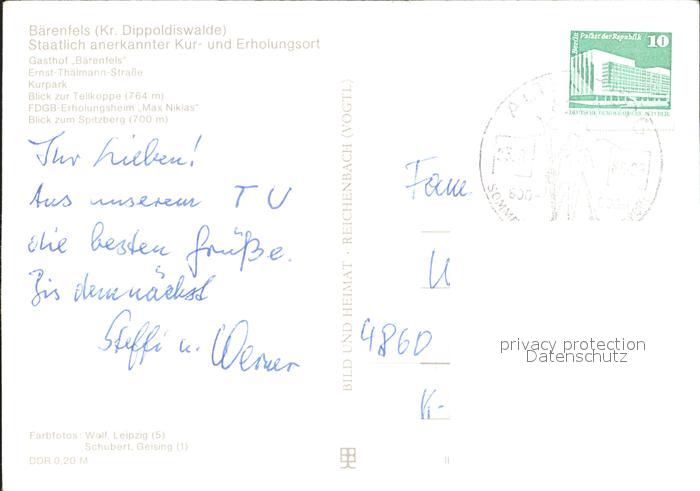 72352701 alte Postkarte Baerenfels Erzgebirge Gasthof Ernst Thaelmann Strasse Kurpark Tellkoppe FDGB Erholungsheim postalisch gelaufen Erhaltung siehe scans KatCode: 11110014290010