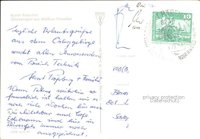 72365546 alte Postkarte Baerenfels Erzgebirge Glockenspiel aus Meissner Porzellan postalisch gelaufen Erhaltung siehe scans KatCode: 11110014290010