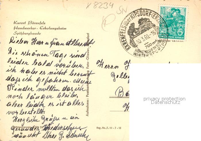 73035823 alte Postkarte Baerenfels Erzgebirge Handwerker Erholungsheim Spitzbergbaude postalisch gelaufen Erhaltung siehe scans [KathaD81] KatCode: 11110014290010