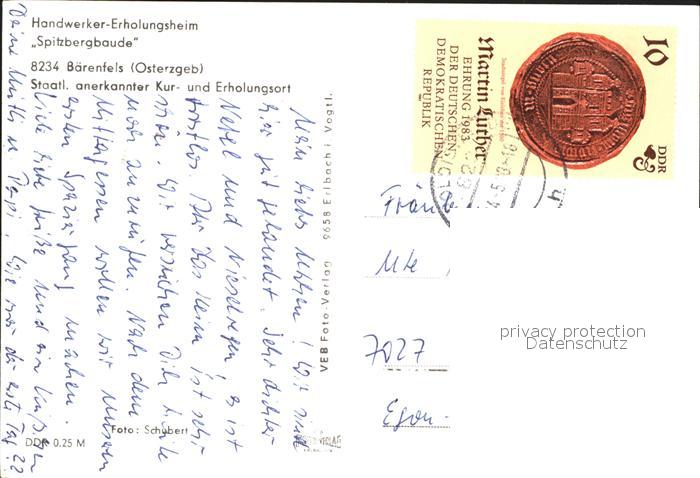 71967733 alte Postkarte Baerenfels Erzgebirge Handwerker Erholungsheim Spitzbergbaude postalisch gelaufen Erhaltung siehe scans KatCode: 11110014290010