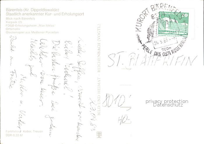 72352702 alte Postkarte Baerenfels Erzgebirge Kurpark FDGB Erholungsheim Ortsmotiv Glockenspiel Meissner Porzellan postalisch gelaufen Erhaltung siehe scans KatCode: 11110014290010