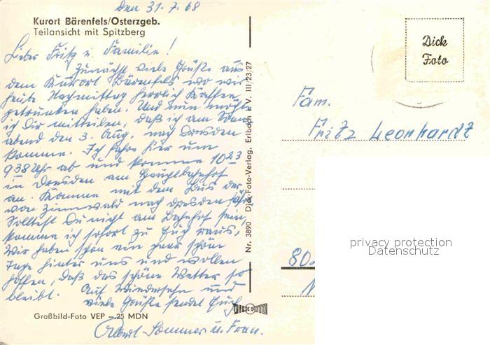 72643959 alte Postkarte Baerenfels Erzgebirge Teilansicht mit Spitzberg Kurort postalisch gelaufen Erhaltung siehe scans [FriedD77] KatCode: 11110014290010