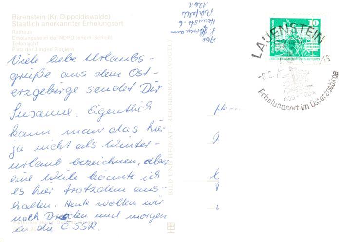 73908065 alte Postkarte Baerenstein Altenberg Rathaus Erholungsheim der NDPD Teilansicht Platz der Pioniere postalisch gelaufen Erhaltung siehe scans [WerneD78] KatCode: 11110014290010