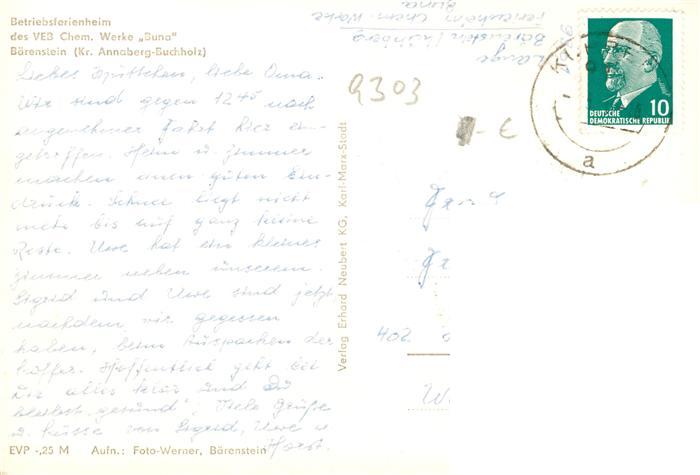 73908270 alte Postkarte Baerenstein Annaberg-Buchholz Betriebsferienheim des VEB Chemische Werke Buna Klubraum Speisesaal Unterkunftshaus auf dem Baerenstein Aussichtsturm postalisch gelaufen Erhaltung siehe scans [FriedD77] KatCode: 11110014171030