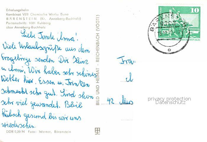 72681509 alte Postkarte Baerenstein Annaberg-Buchholz Erholungsheim Kombinat VEB Chemische Werke Buna postalisch gelaufen Erhaltung siehe scans [LiesaD40] KatCode: 11110014171030