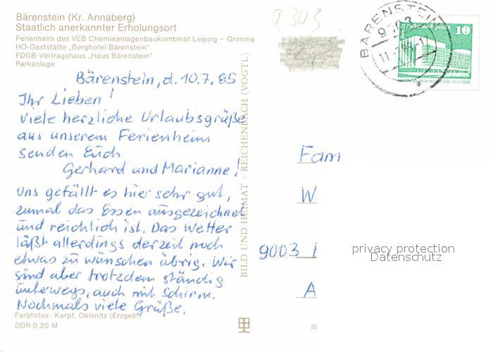 72750657 alte Postkarte Baerenstein Annaberg-Buchholz Ferienhem VEB Chemieanlagenbau HO Gaststaette Berghotel Baerenstein postalisch gelaufen Erhaltung siehe scans [KathaD81] KatCode: 11110014171030