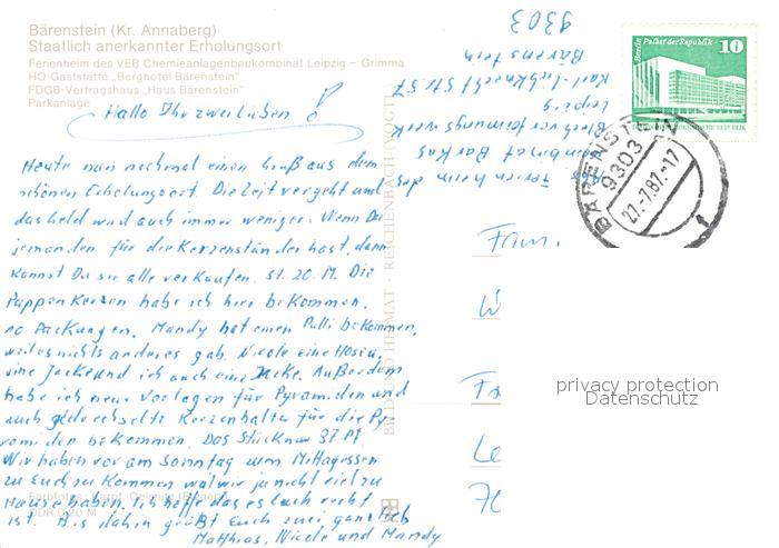 73089369 alte Postkarte Baerenstein Annaberg-Buchholz HO Gaststaette Berghotel Baerenstein Park Ferienheime postalisch gelaufen Erhaltung siehe scans [KathaD81] KatCode: 11110014171030